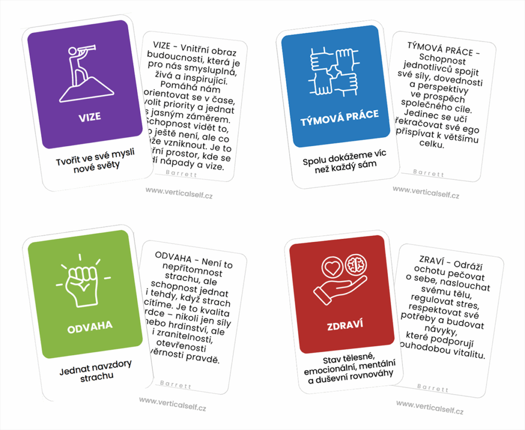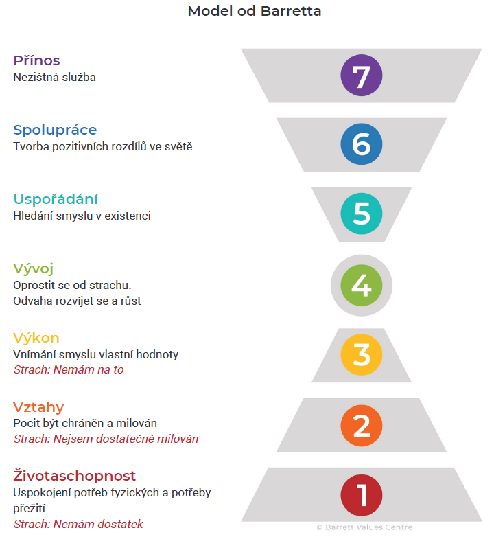 Mentoringový program VerticalSelf pracuje s hodnotami podle Barrettova modelu (www.valuescentre.com). Podle Barrettova modelu každá lidská bytost na světě roste a rozvíjí se v sedmi přesně definovaných oblastech. Každá oblast se zaměřuje na konkrétní potřeby, které jsou společné pro všechny. Úroveň růstu a rozvoj jedince závisí na jeho schopnosti uspokojit tyto potřeby. V různých obdobích můžeš pozorovat, že se zaměřuješ na některé úrovně více a na jiné méně. Je to způsobeno v reakci na měnící se životní podmínky. Je důležité pochopit, že v daných sedmi úrovních není vyšší úroveň lepší než nižší; například bude pro tebe těžké zaměřovat se na pomoc druhým, máš-li zdravotní nebo finanční problémy. Zmíněných sedm oblastí v rozvoji a růstu osobního povědomí je znázorněno v následujícím diagramu.